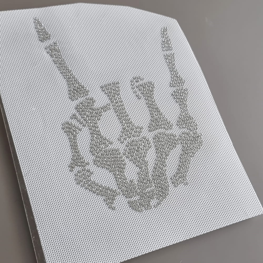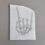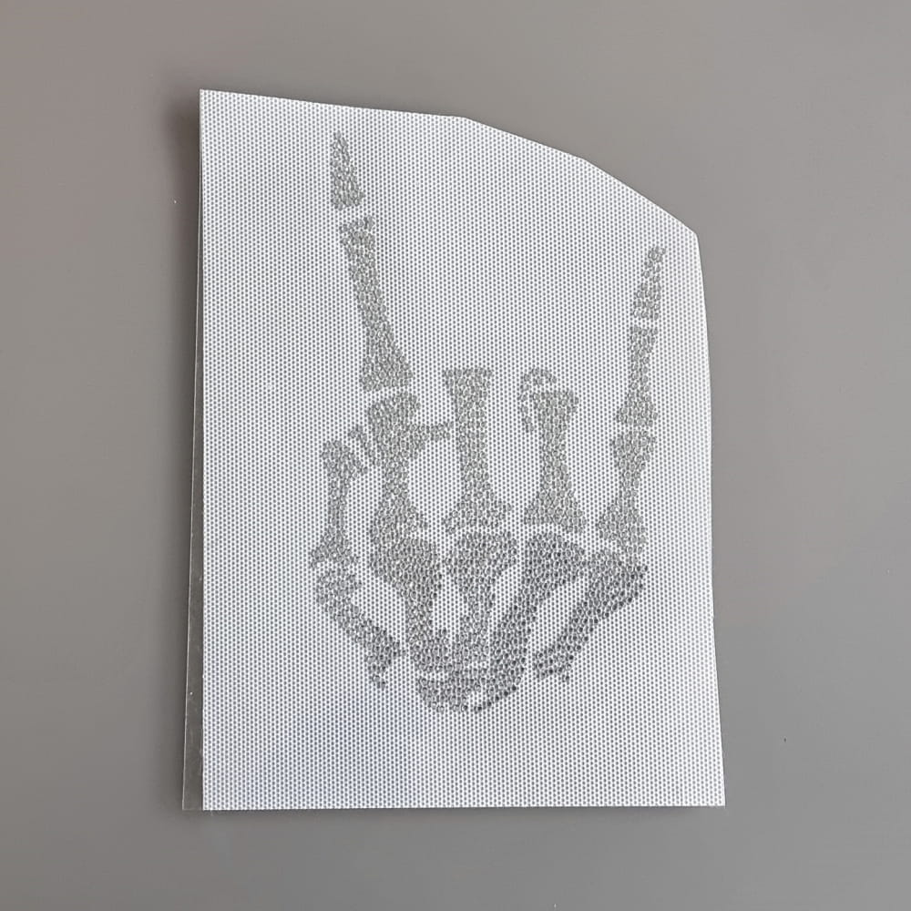 Kolejna, młodzieżowa wklejka wykonana z błyszczących, krystalicznych dżetów (zwanych często cyrkoniami). Wklejka wykonana jest z drobnych, 2mm kamyków, które w łatwy sposób możecie wkleić na ulubioną bluzę lub t-shirt. Nasz motyw przedstawia znany gest - tzw. devil's horns, w tej wersji jednak wykonany przez dłoń kościotrupa - zobaczcie tylko te charakterystyczne kostki. Cały motyw możecie z łatwością wgrzać na wybraną odzież. Jeżeli zastanawiacie się jak to zrobić, koniecznie przeczytajcie nasza poniższą instrukcję.