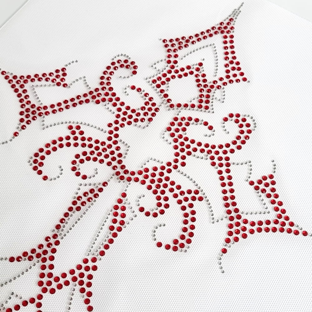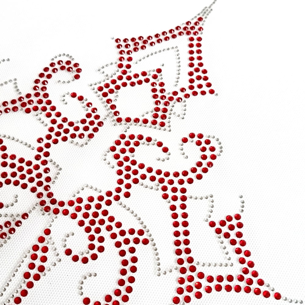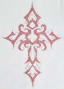 Bardzo duży motyw dżetowy w kształcie krzyża - motyw ma ponad 38 cm wysokości, a więc wybierając go pamiętajcie żeby mieć tyle miejsca na odzieży, na którą chcecie go nakleić. Wklejka ułożona została z delikatnych przezroczystych cyrkonii połączony z bardziej wyrazistymi czerwonymi kamieniami, które nadają jej charakter. Nasza naprasowywanka będzie fantastyczną ozdobą zarówno przodów bluz czy koszulek jak i pleców - możecie ją przykleić np. na plecy kurtek jeansowych.