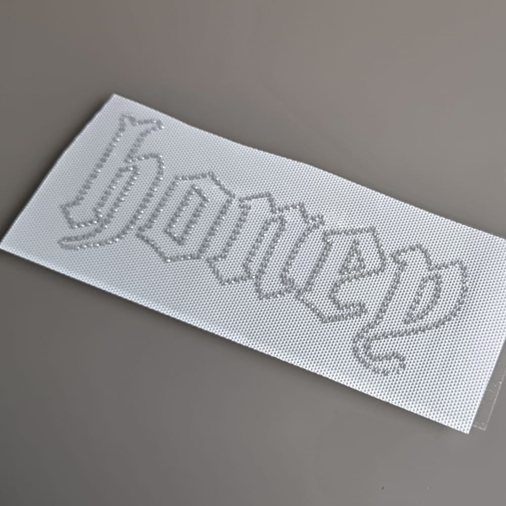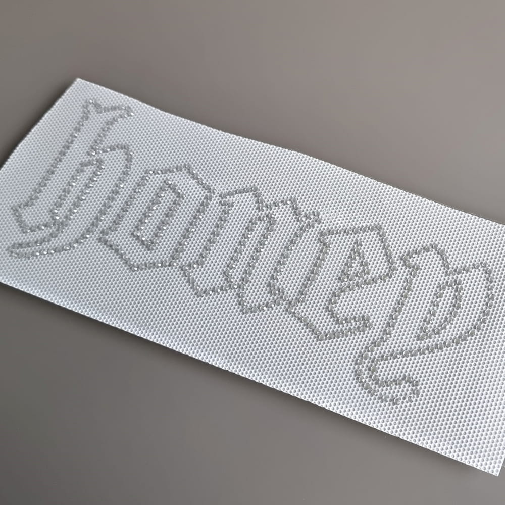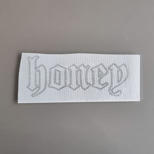 Prosty napis Honey ułożony z delikatnych, drobnych cyrkonii. Cały napis wygląda niezwykle delikatnie bo nie został w całości wypełniony kamieniami- jedynie ramka literek ułożona jest z cyrkonii. Wszystko to sprawia, że jest niezwykle lekki, a więc nie będzie obciążał nawet delikatnych materiałów - chociażby siatek czy cienkich koszulkowych dzianin.