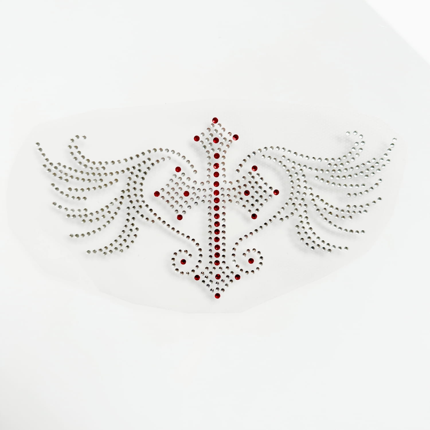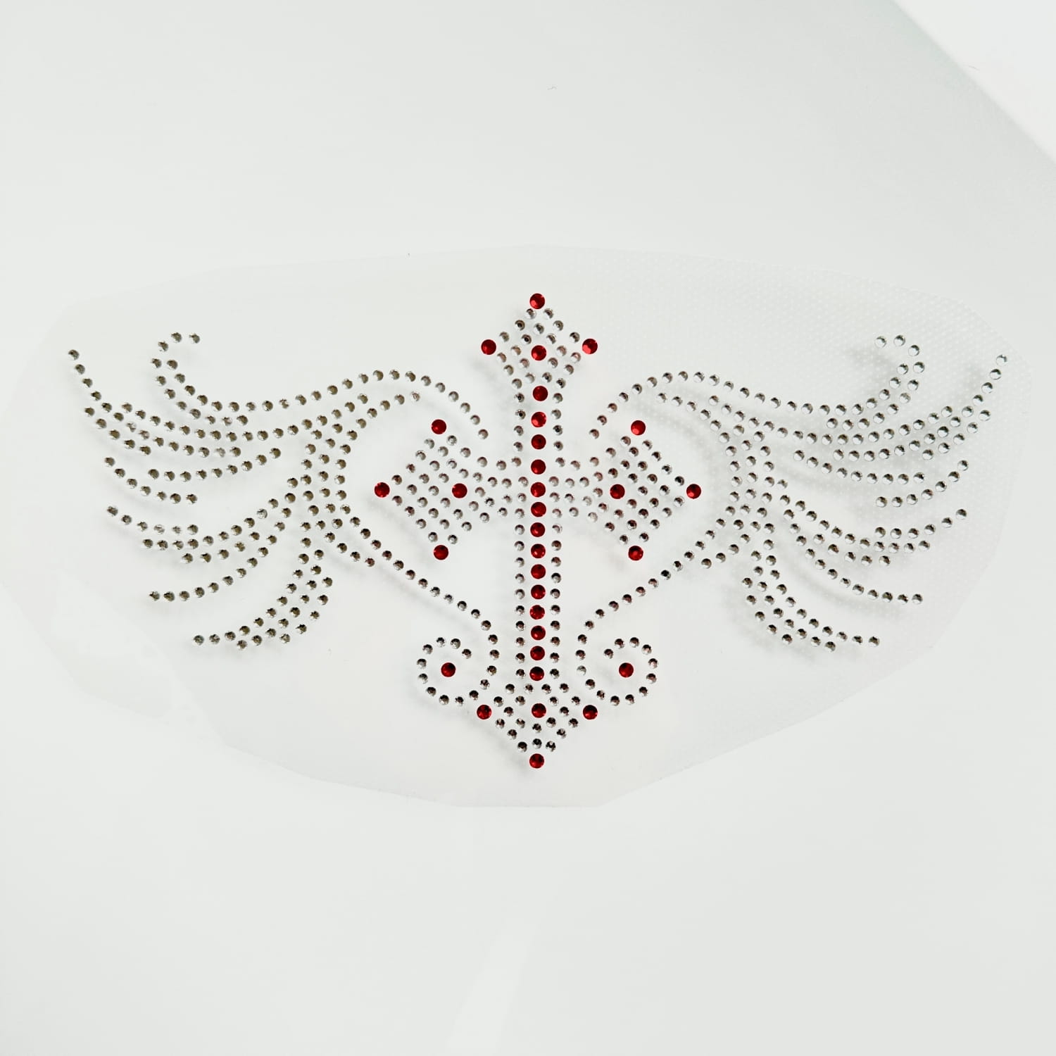 Naprasowanka na odzież ze srebrnymi i czerwonymi cyrkoniami - Mały krzyż ze skrzydłami 16x6 x 8,6 cm