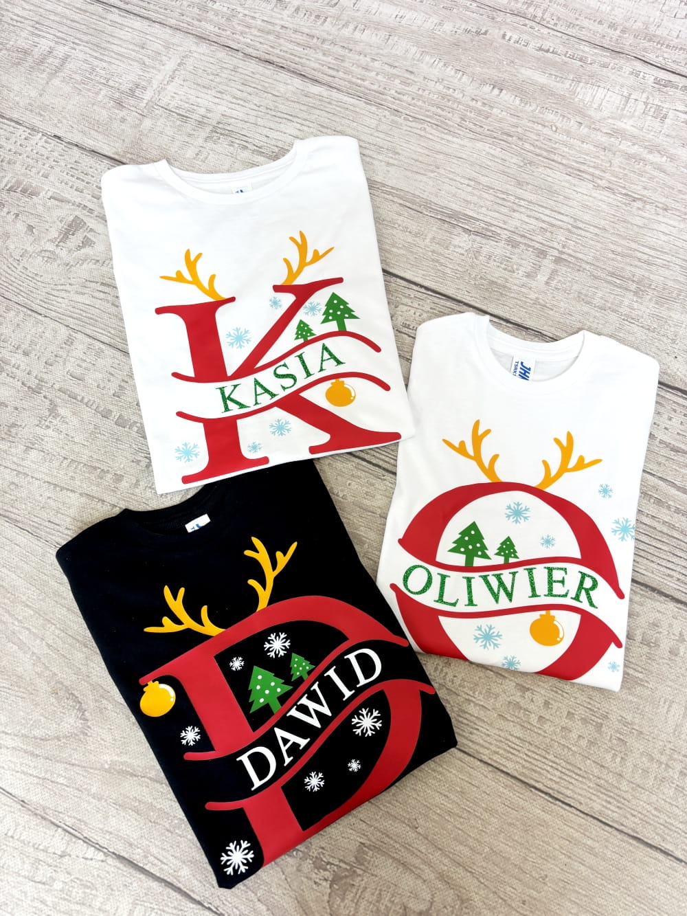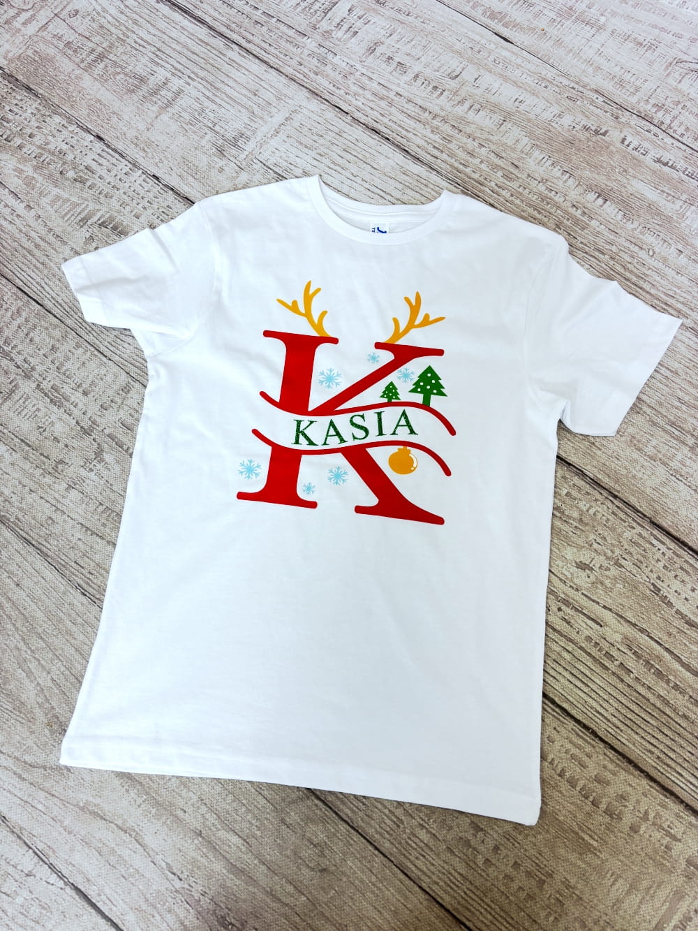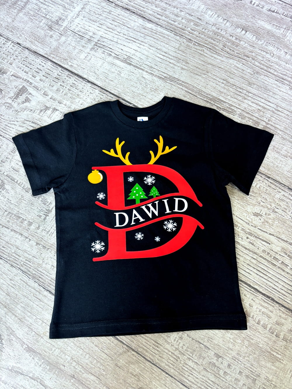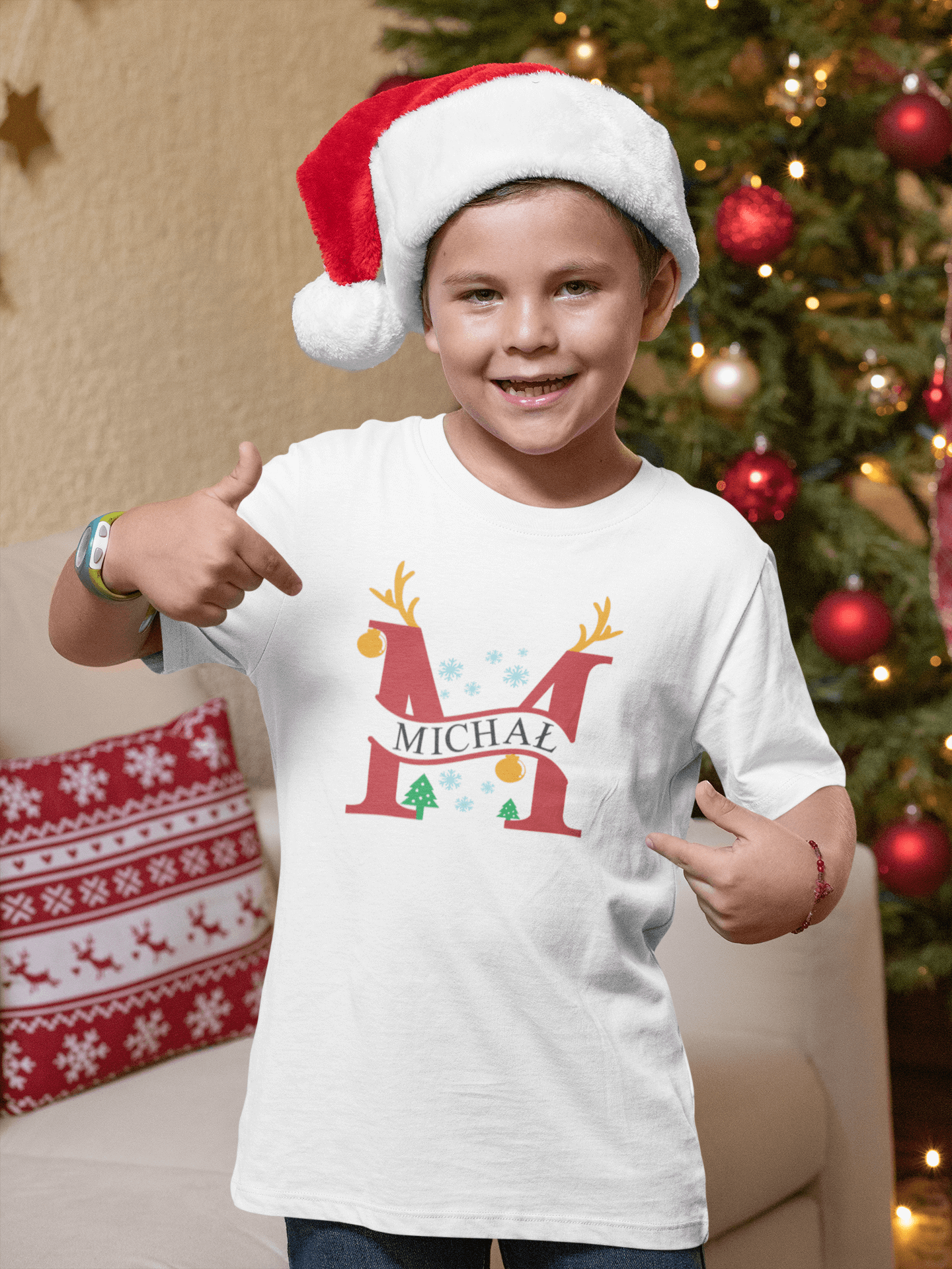Stwórz razem z nami wyjątkową koszulkę dla Swojego dziecka. W te święta możesz ubrać je w personalizowaną koszulkę, wykonaną specjalnie dla niego! Koszulka w dwóch kolorach do wyboru - czarna lub biała ze świątecznym nadrukiem pierwszej litery imienia, a do tego jego imię w specjalnie wyznaczonym miejscu. Litera jest w otoczeniu świątecznych akcentów: rogów renifera, śnieżynek, bombki i choinek. To świetny Bożonarodzeniowy akcent!