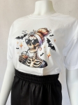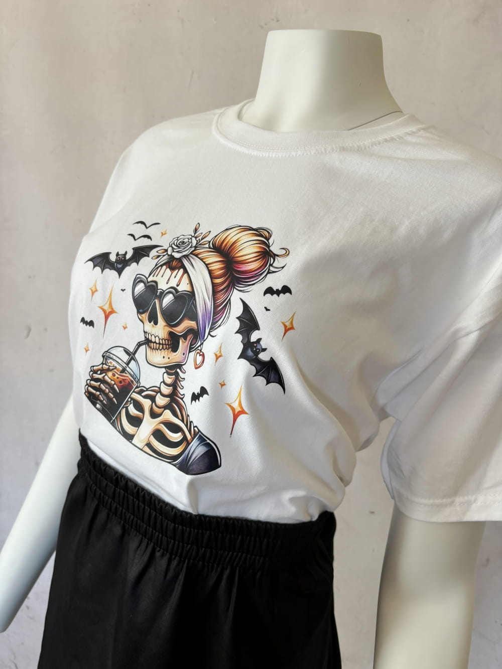 Ten wyjątkowy t-shirt na Halloween to połączenie humoru i stylu! Na koszulce znajduje się zabawny nadruk przedstawiający kobietę kościotrupa w otoczeniu nietoperzy, trzymającą kubek kawy – idealny motyw dla tych, którzy uwielbiają kawę nawet po drugiej stronie! Koszulka dostępna jest w klasycznych kolorach: białym i czarnym, co sprawia, że pasuje do każdej stylizacji. Wykonana z wysokiej jakości bawełny, jest nie tylko wygodna, ale i trwała. To doskonały wybór na Halloweenowy look z przymrużeniem oka, który z pewnością wywoła uśmiech na twarzach!