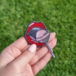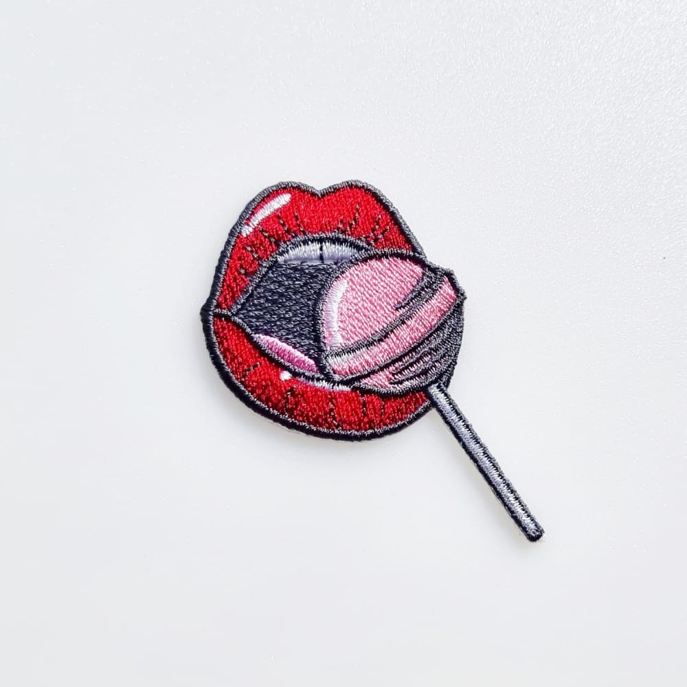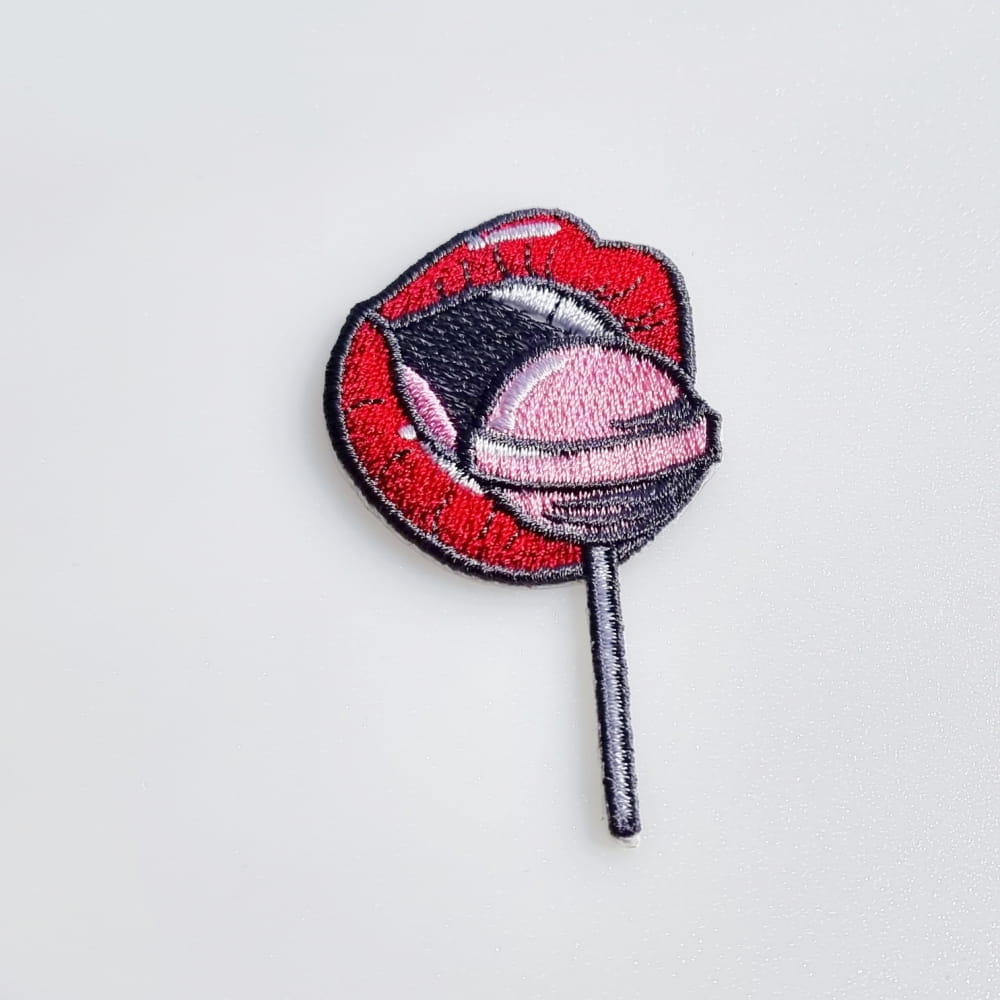 Haftowana naszywka TERMO, naprasowanka na ubranie - Czerwone usta z lizakiem 5,6 x 6,3 cm