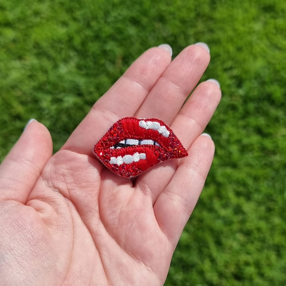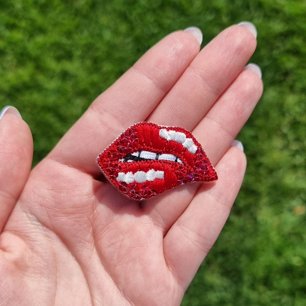 Tym razem przygotowaliśmy dla Was naszywkę w kształcie ust z lekko widocznymi zębami. Aplikacja jest filigranowa, w soczystych odcieniach czerwieni podkreślonej błyszczącymi cekinami. Naszywka jest w 100% wykonana gęstym haftem dzięki czemu jest dość sztywna. Od spodu posiada warstwę specjalnego kleju (tzw. termofolii) więc wystarczy ją przykleić żelazkiem do wybranej odzieży - np. tuniki albo czapki z daszkiem. Poniżej znajdziecie bardzo prostą instrukcję naklejania naszych wklejek: