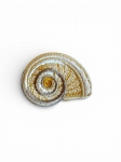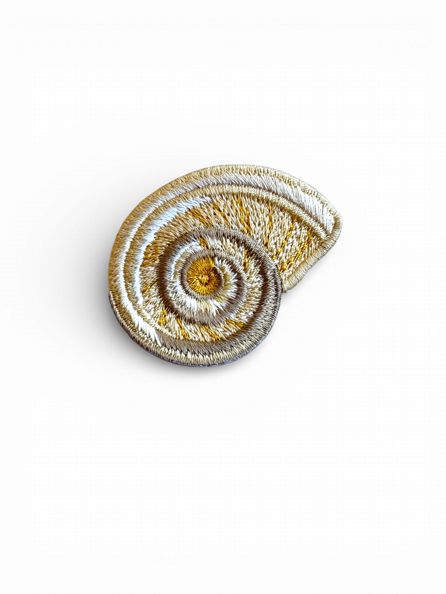 Elegancka naszywka haftowana w kształcie spiralnej muszli inspirowana naturalnymi formami morza. Starannie wykonany haft w odcieniach złota, beżu i kremu tworzy efekt głębi oraz subtelnego połysku, dzięki czemu naszywka wygląda wyjątkowo dekoracyjnie na odzieży.