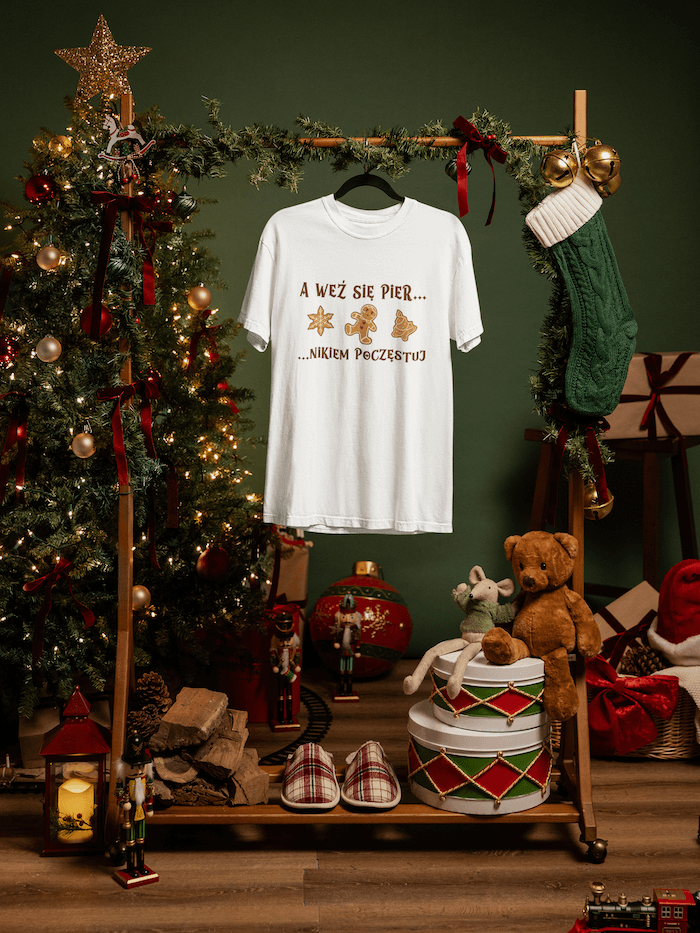 Świąteczna koszulka z humorem, która od razu wywołuje uśmiech i idealnie wpisuje się w bożonarodzeniowy klimat.