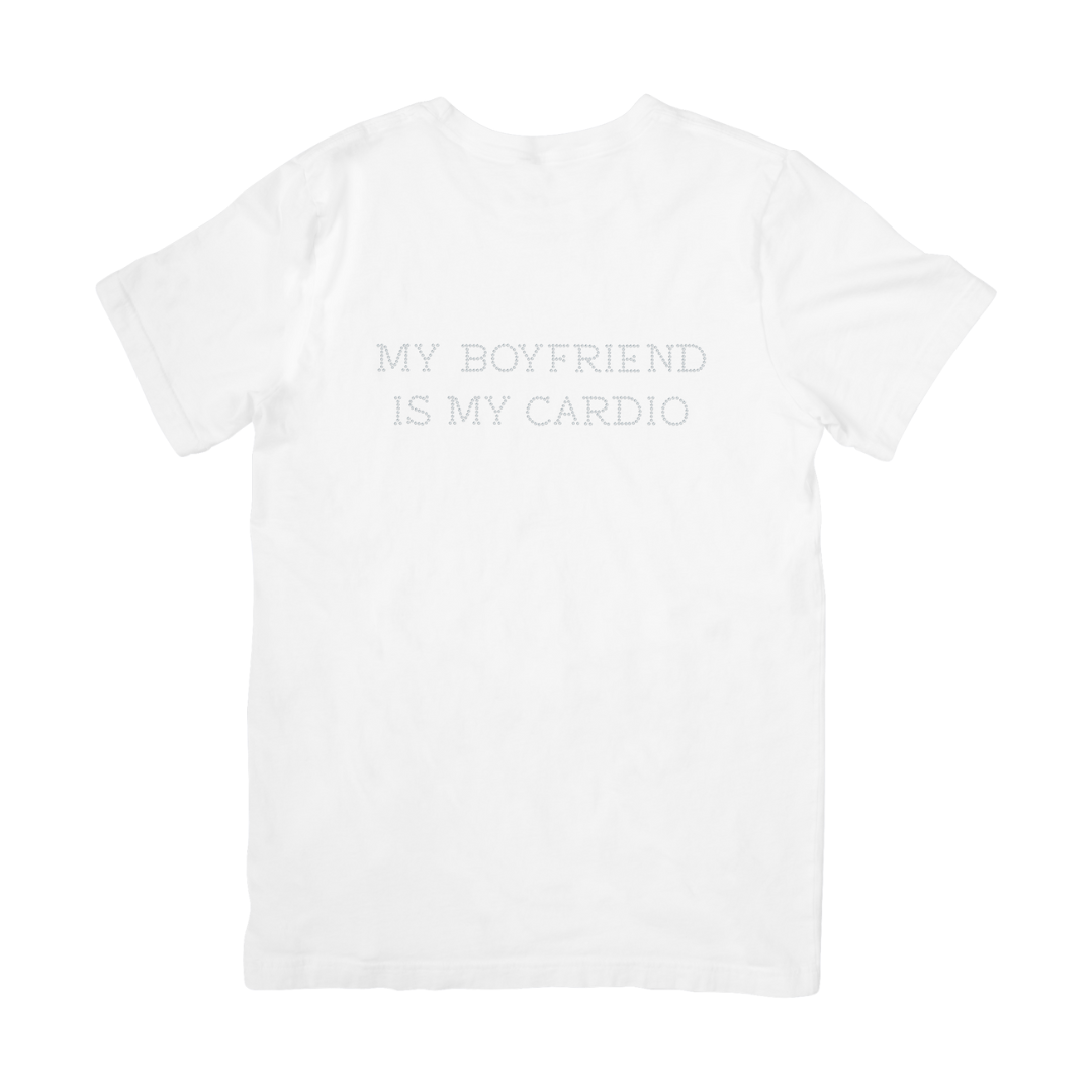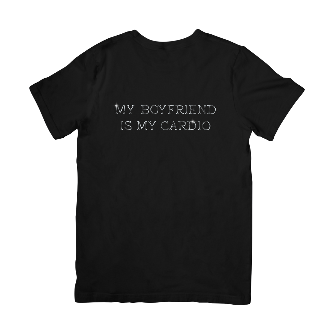 Wyróżnij się z tłumu z naszą stylową koszulką ozdobioną unikalnym napisem „My Boyfriend is My Cardio” wykonanym z diamentowych cyrkonii. Ta koszulka to idealny sposób, aby dodać trochę blasku do swojej codziennej garderoby, jednocześnie wyrażając swoją miłość i poczucie humoru.