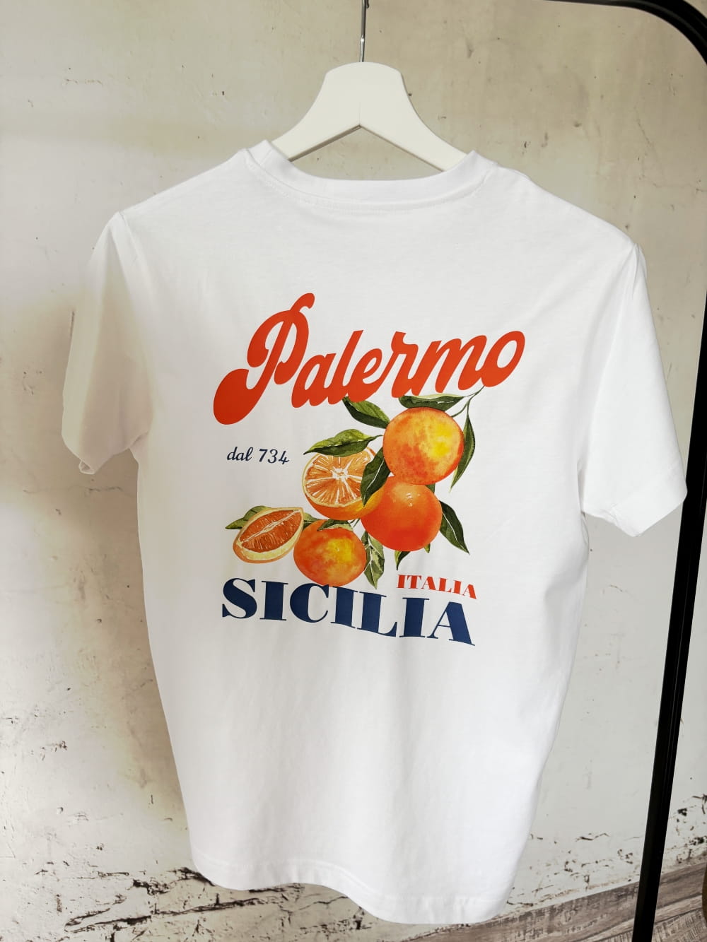 Przenieś się na rozgrzane słońcem ulice Sycylii dzięki tej wyjątkowej koszulce z nadrukiem Palermo. Tył zdobi intensywny, pełen koloru nadruk z dojrzewającymi pomarańczami i włoskim klimatem Palermo, który aż pachnie latem. Z przodu – subtelny napis Palermo otoczony delikatnymi listkami – mały akcent, który mówi wszystko.