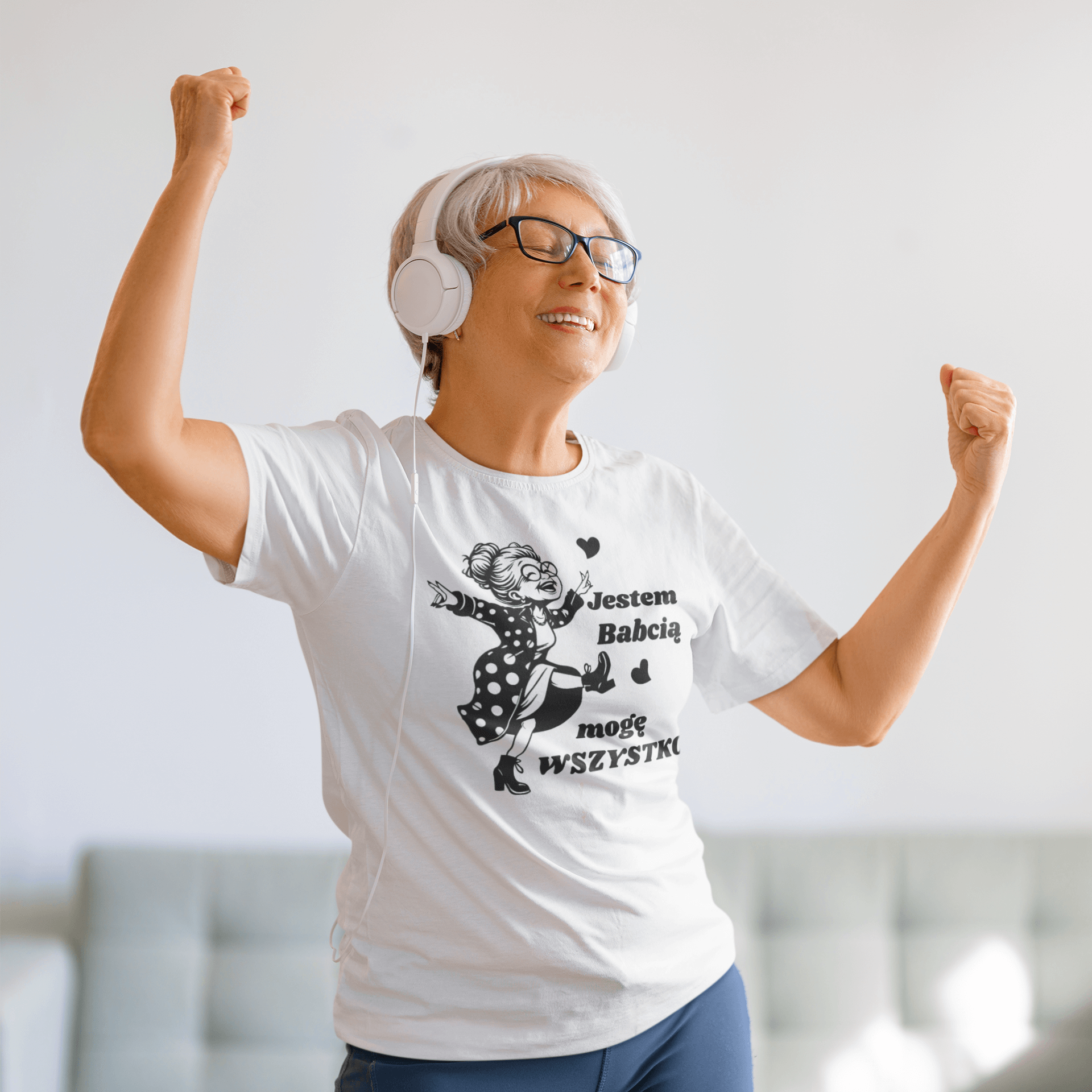 Wyjątkowa koszulka na Dzień Babci z radosnym, humorystycznym nadrukiem. Grafika przedstawiająca tańczącą babcię oraz hasło „Jestem Babcią – mogę wszystko” podkreślają energię, dystans do siebie i ogromną siłę każdej babci.