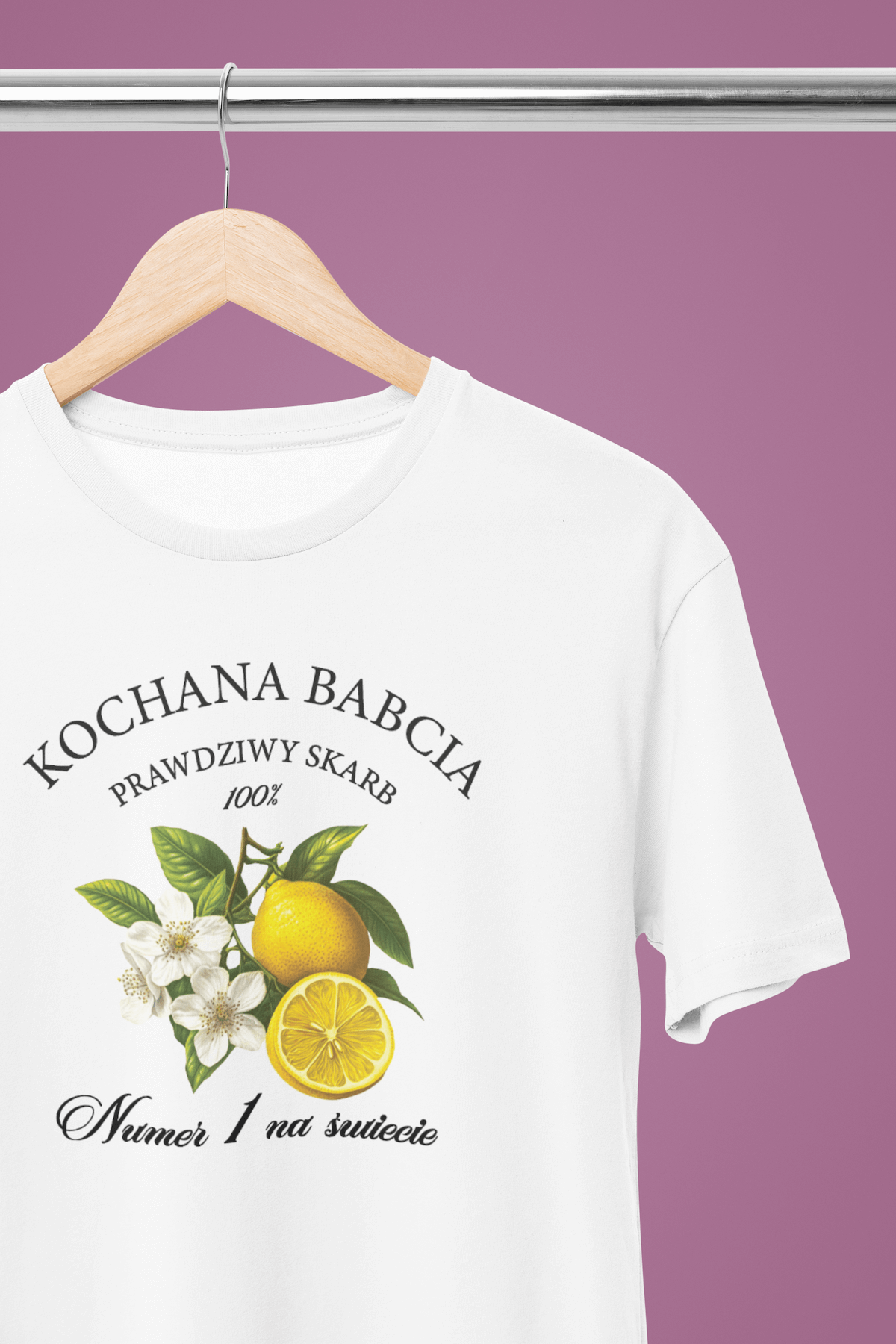 Naturalny motyw cytryn i kwiatów nadaje koszulce lekkości i ponadczasowego charakteru, a klasyczna typografia sprawia, że projekt prezentuje się elegancko i uniwersalnie. To doskonały wybór na Dzień Babci, urodziny lub jako wyjątkowy upominek bez okazji.