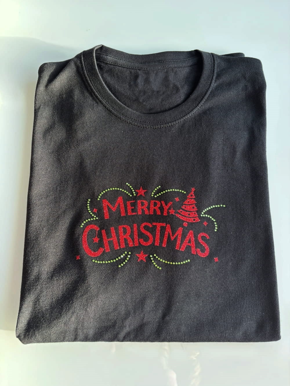 - Wyjątkowy design: Na przodzie koszulki znajduje się błyszczący wzór z napisem Merry Christmas.