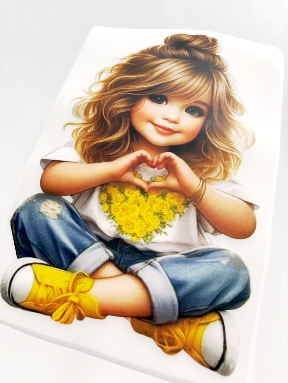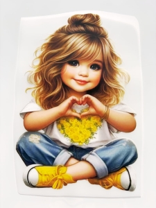Kolejna urocza wklejka, którą dla Was przygotowaliśmy to postać dziewczynki w długich, blond włosach. Ubrana w niebieskie jeansy, białą koszulkę w kwiaty i żółte trampki. Pokazuje w naszą stronę serduszko ułożone z dłoni. Ten nadruk świetnie sprawdzi się na koszukach, bluzach a nawet kurtkach jeansowych.