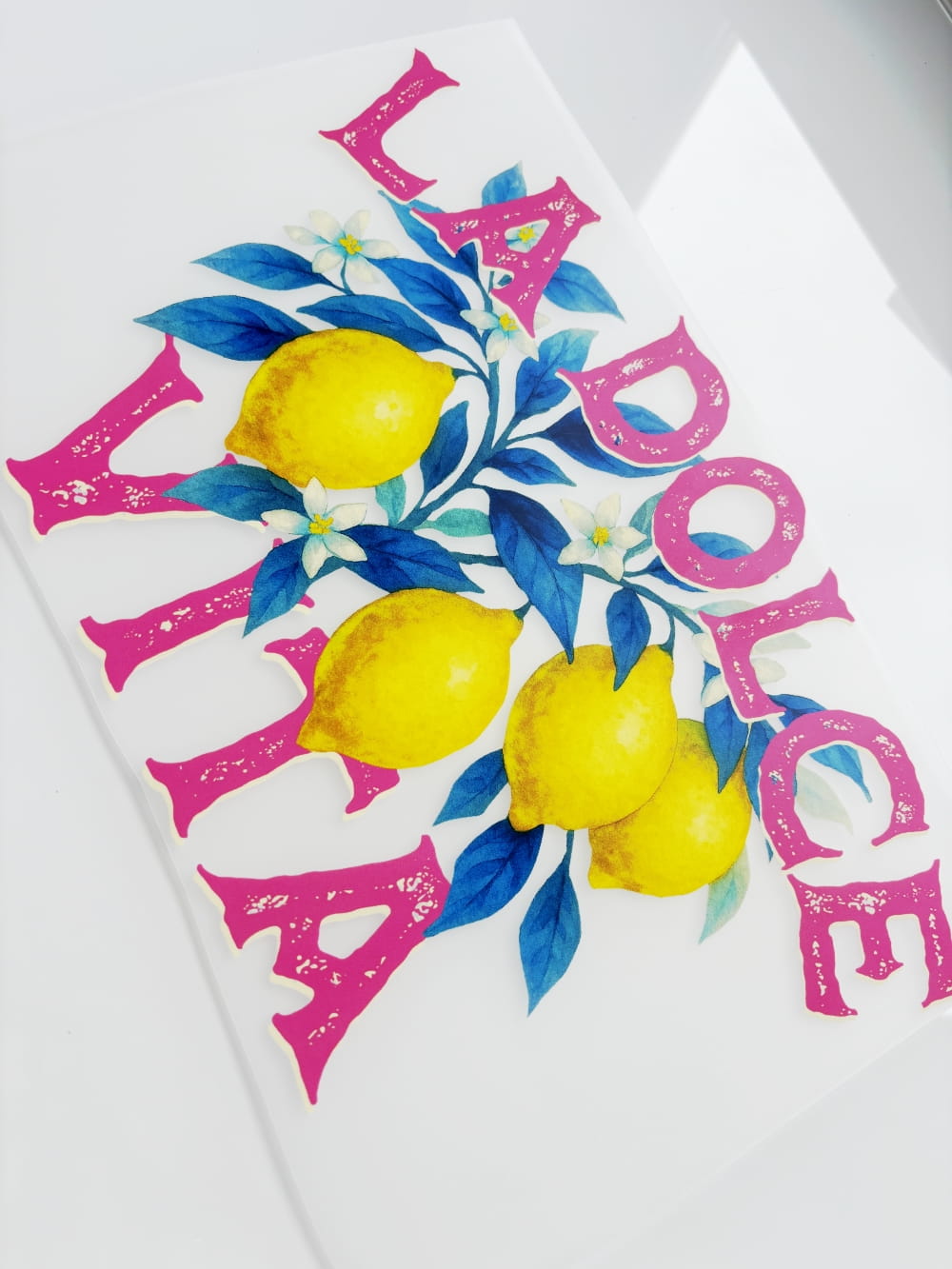Zanurz się w słodkim klimacie włoskiego lata! Różowy napis „LA DOLCE VITA” otoczony dojrzewającymi cytrynami i soczystą zielenią to eksplozja wakacyjnych skojarzeń – luz, słońce i smak życia w najczystszej postaci. Idealna grafika dla wszystkich, którzy chcą dodać swojej odzieży charakteru i południowego temperamentu.