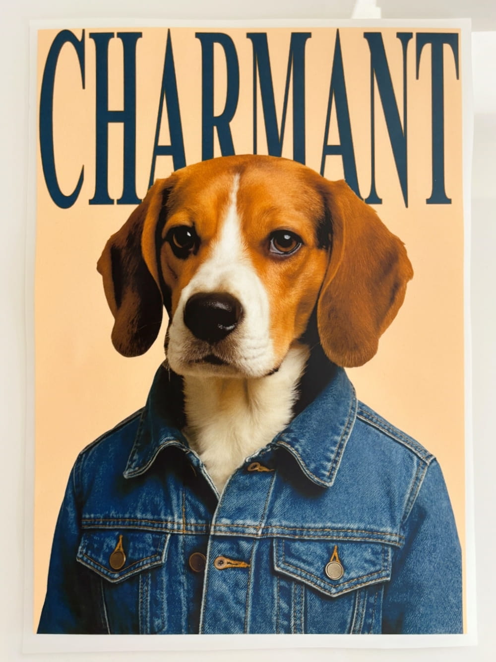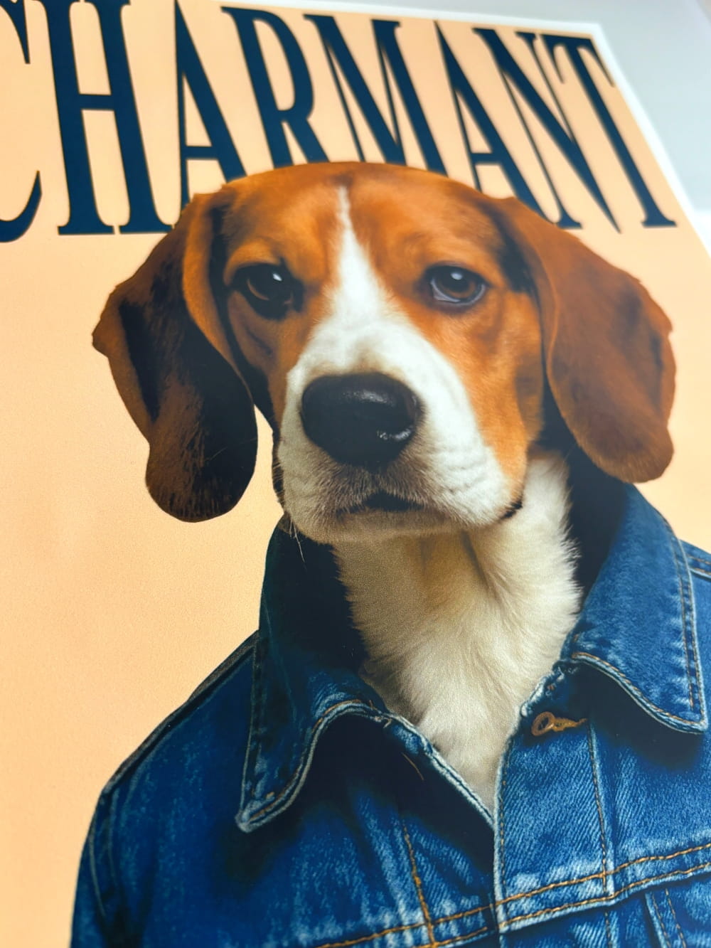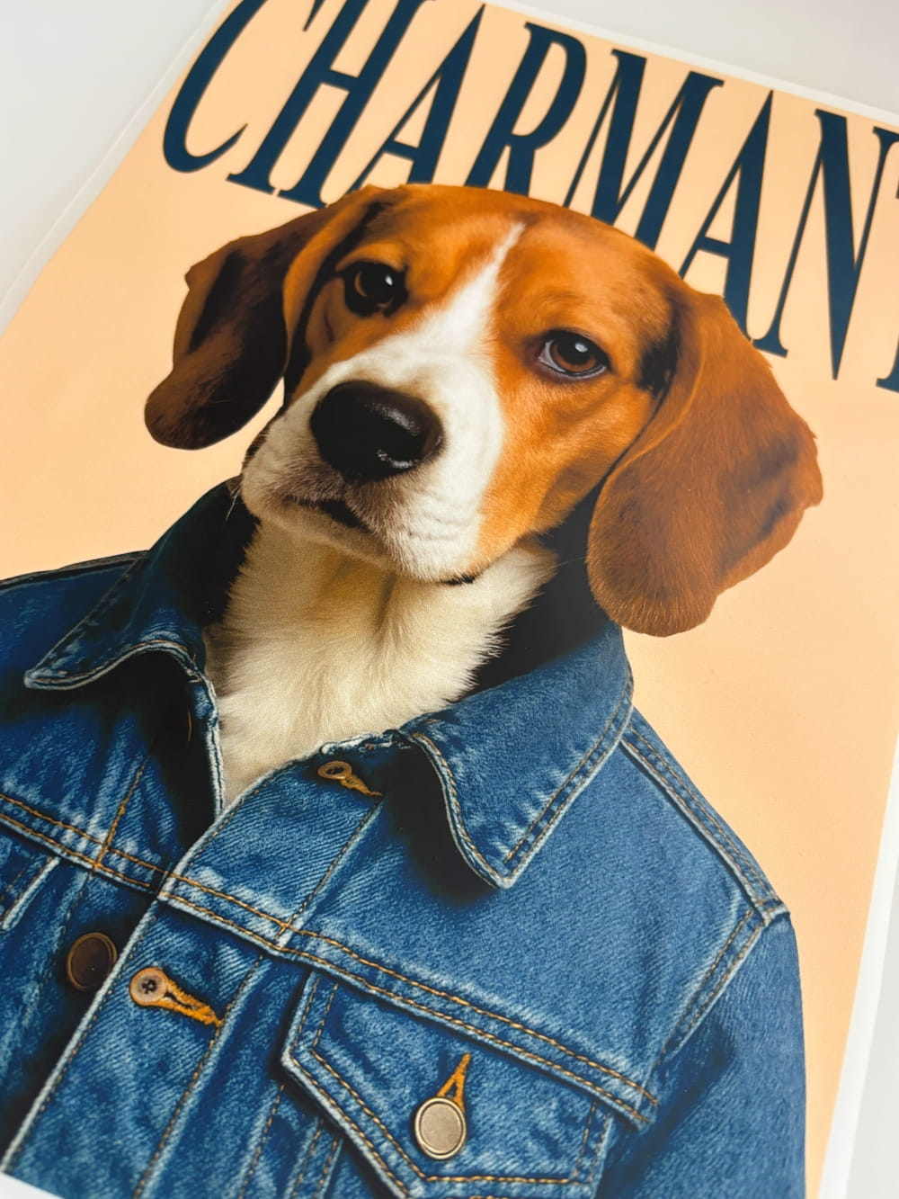 Przedstawiamy "Charmant" – wyjątkowy nadruk, który doda Twojej garderobie szczyptę humoru i elegancji! Ten unikalny design przedstawia uroczego beagla, ubranego w stylową, jeansową kurtkę. To połączenie klasycznego stylu z czarującym, psim spojrzeniem sprawia, że ten nadruk jest absolutnie niepowtarzalny.