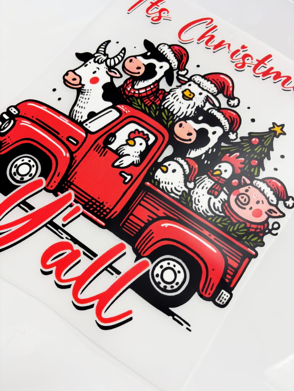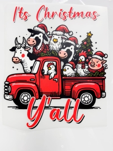 Wprowadź świąteczny klimat z nutą wiejskiego uroku dzięki tej naprasowance! Wzór przedstawia urocze zwierzęta z farmy – krowy, świnkę, kurczaki i owcę – ubrane w czapki Mikołaja, jadące czerwonym, stylowym pickupem ozdobionym choinką i wiankiem. Hasło "It's Christmas Y'all" nadaje całości przyjazny, świąteczny charakter.