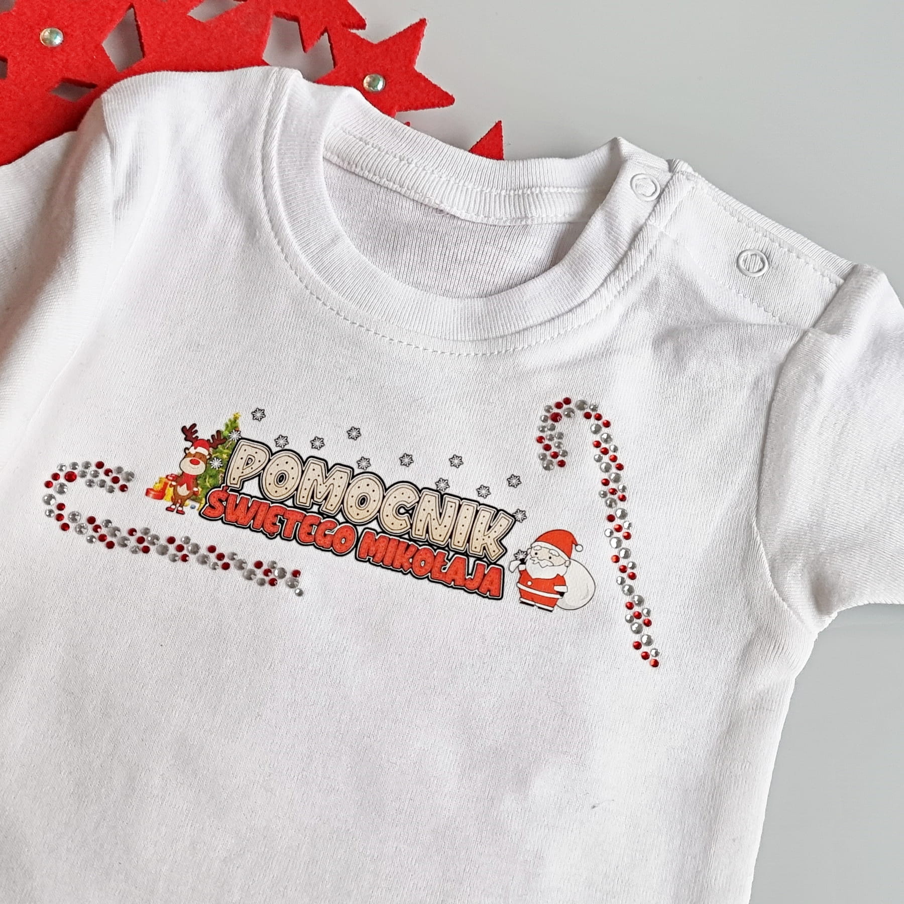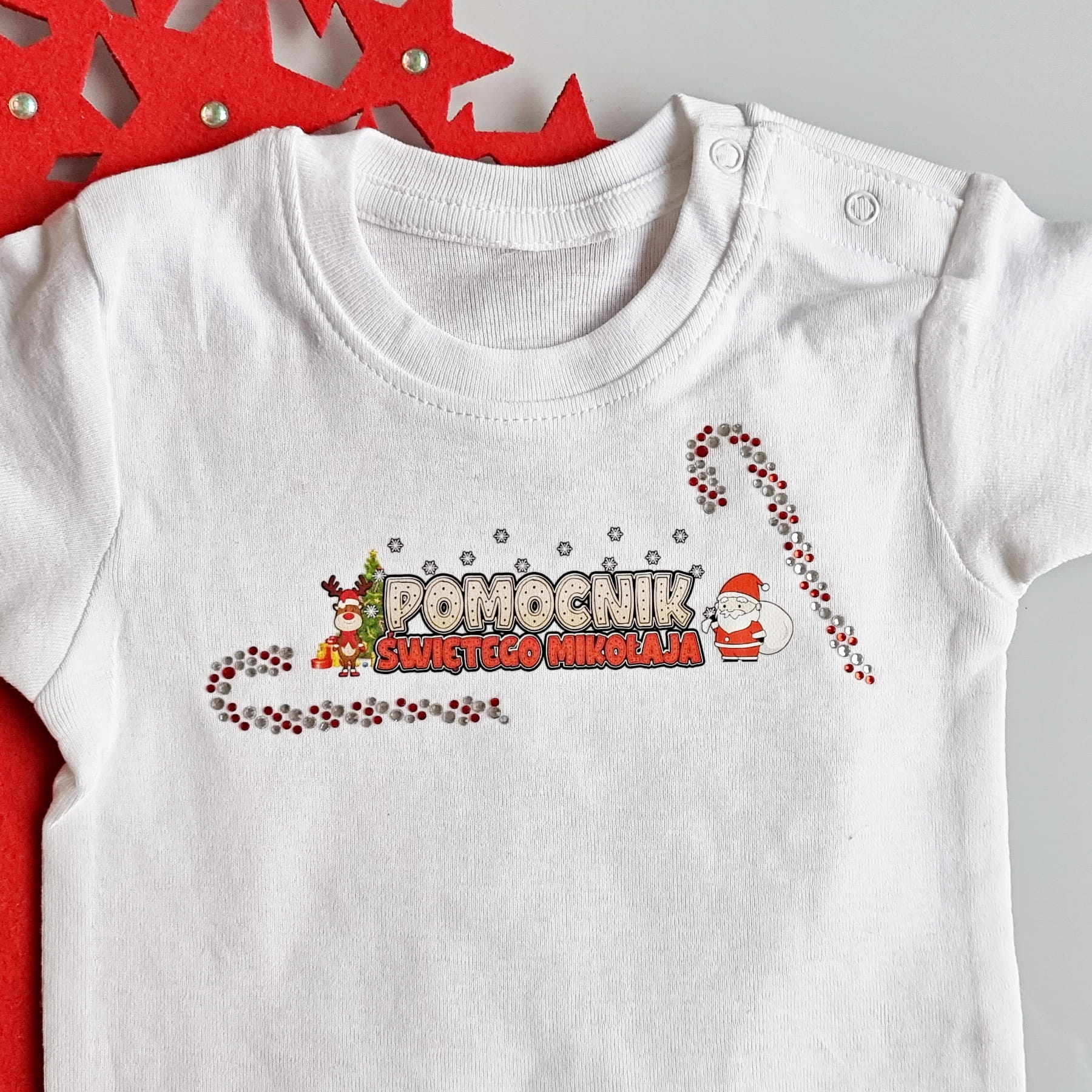 Uroczy, świąteczny napis na bluzy i koszulki waszych dzieci. Napis ma 15 cm szerokości, a więc jest idealny na ubranka starszych dzieci (sprawdźcie również nasz motyw o szerokości 11 cm). Możecie go dodatkowo połączyć ze świątecznymi lizakami "laskami", dostępnymi w naszej ofercie (laski ułożone są z błyszczących cyrkonii). Nasza wklejka to idealny sposób na samodzielne wykonanie ubranka na święta dla Waszych pociech. Wystarczy zwykła koszulka czy bodziak i żelazko i jesteście w stanie sami wykonać zdobienie! Spróbujcie nakleić motyw dzieciakami i zobaczcie jaka to będzie dla nich frajda! Nie ograniczajcie się do zwykłych wypieków pierniczków i w tym roku postawcie na samodzielnie wykonane stroje!