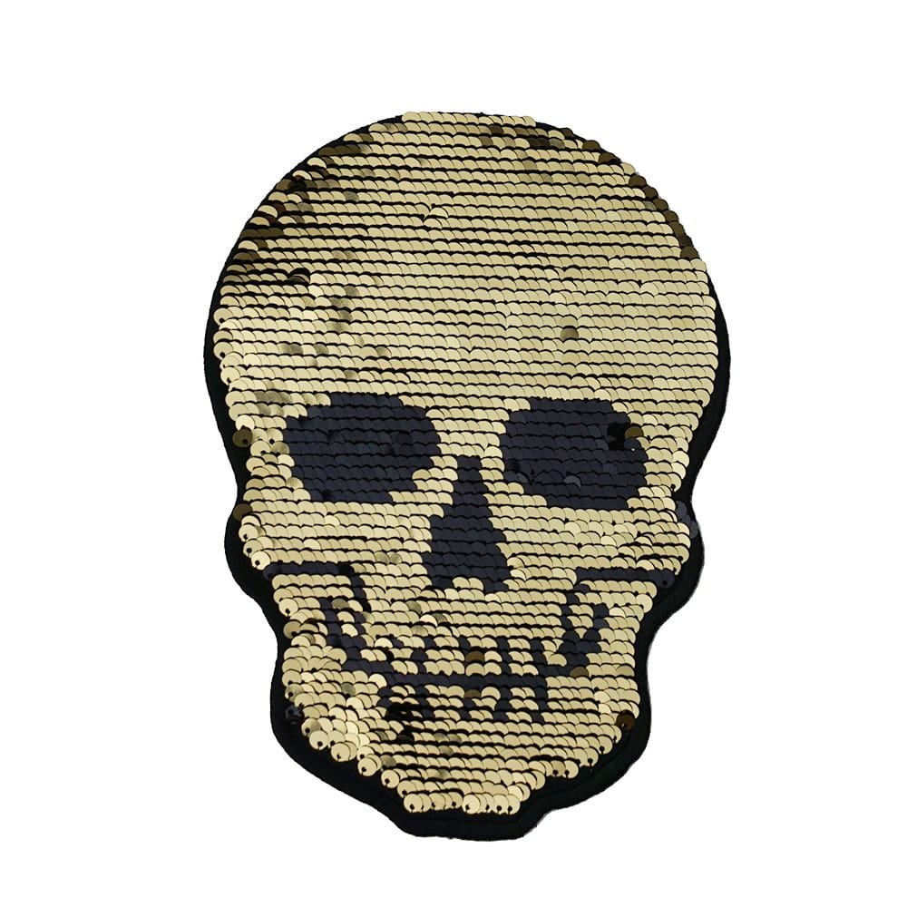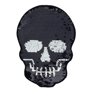 Czaszka z cekinów odwracalnych? Czemu nie! Nasza czaszka to idealny sposób na ozdobę koszulki lub bluzy, albo stroju na Halloween. Nie musicie wybieracie koloru, bo nasza aplikacja to tak naprawdę dwie różne wersje kolorystyczne tej samej czaszki. Gdy opuścicie cekiny w dół czaszka będzie czarno-srebrna, ale gdy przesuniecie ręką po cekinach w górę zmienicie kolorystykę na złoto-czarną! Możecie również odwrócić tylko połowę cekinów i otrzymacie jedną czaszkę w różnych wersjach kolorystycznych! Nasze cekiny acentryczne wykończyliśmy haftowanym brzegiem przez co są bardziej eleganckie. Oczywiście od spodu, jak zawsze dodaliśmy warstwę termofolii, a więc możecie całą naszywkę nakleić na odzież przy pomocy żelazka w zaciszu własnego domu! Zobaczcie jakie to proste: