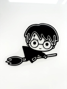 Dla fanów magicznego świata i Harrego Pottera. Naprasowanka z czarnej folii przedstawiająca śmigającego na miotle Harrego. Czarna folia świetnie wkomponuje się do każdej stylizacji i doda oryginalności twoim ubraniom! Harry został wykonany w formie bajkowej z dlugim płaszczem i charakterystycznymi okrągłymi okularami. Jeśli jesteś fanem Pottera lub masz go wśród swoich bliskich ta naprasowanka będzie świetnym rozwiązaniem!