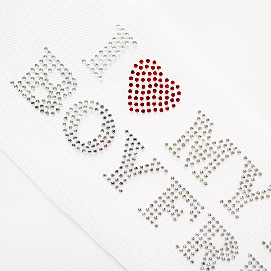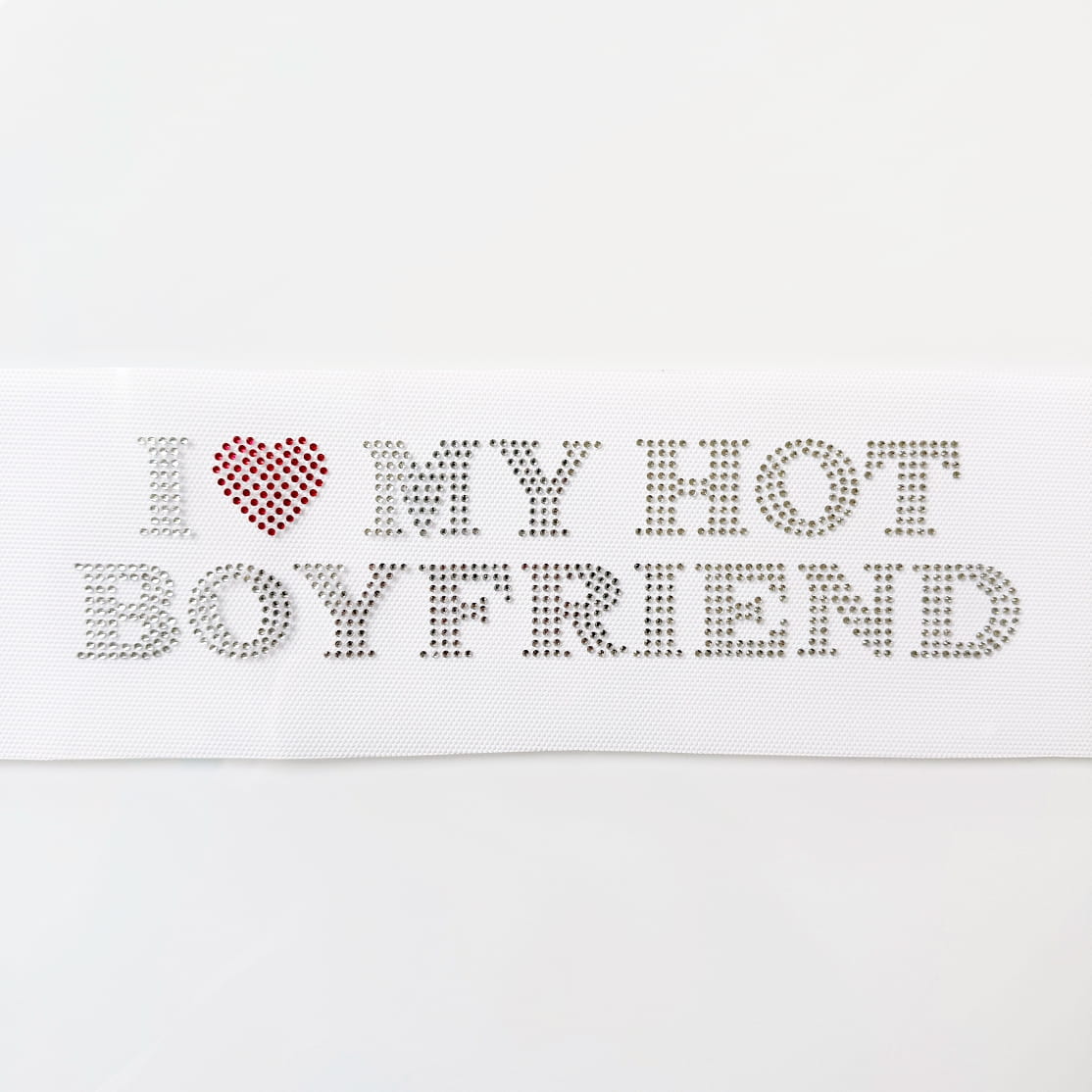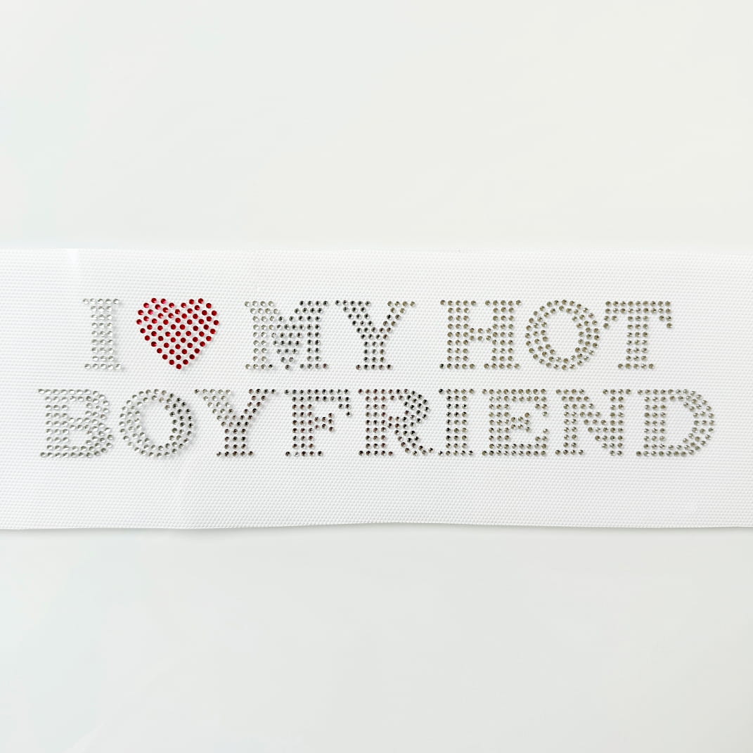 Naprasowanka na odzież z cyrkoniami - I love my hot boyfriend 24,6 x 5,7 cm