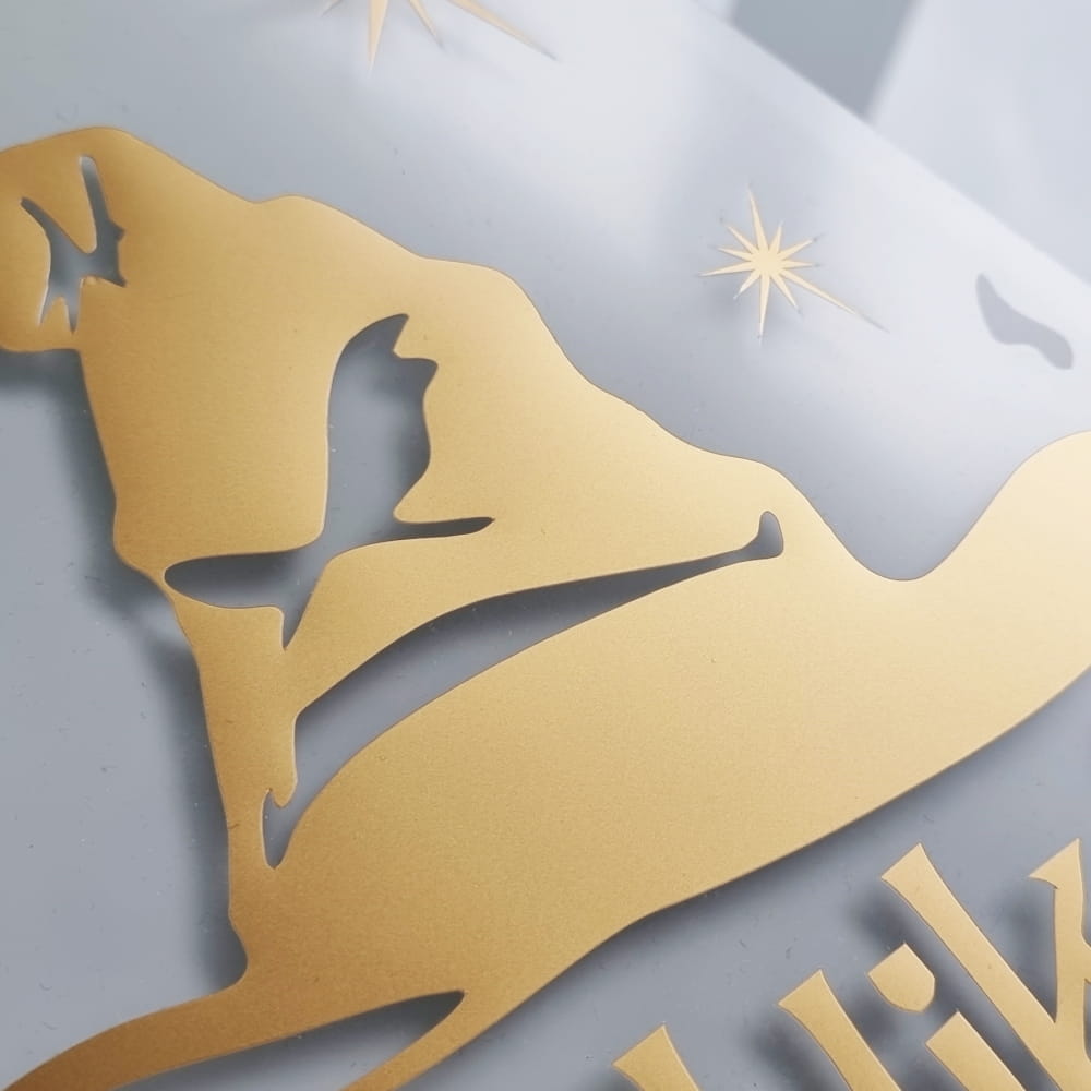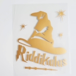Tym razem mamy coś dla fanów Harre'go Pottera, a przynajmniej tak kojarzy nam się ten wzór. Tak naprawdę przedstawia on po prostu magiczny kapelusz przypominający tiarę (może być to słynna tiara przydziału), magiczne gwiazdki oraz najważniejszy gadżet czyli różdżkę! Żeby tego było mało, dorzuciliśmy magiczne zaklęcie "Riddikulus", które jak pamiętają fani Harrego, pozwalało zmienić bogina w coś śmiesznego. Cały wzorek wycięty jest ze złotej folii, a jego naklejenie na pewno będzie dla was bardzo proste, bo wymaga tylko posiadania żelazka i chwili wolnego czasu - poniżej znajdziecie dokładną instrukcję wklejania naszych naprasowywanek.