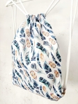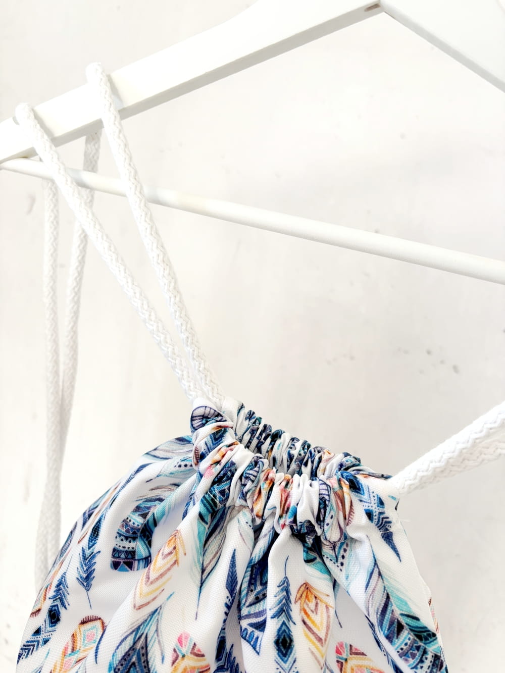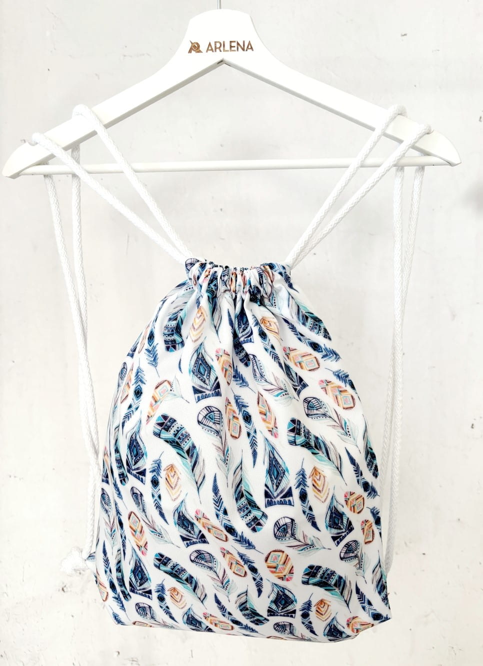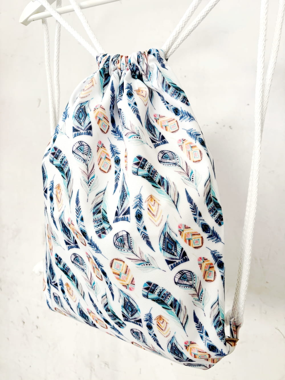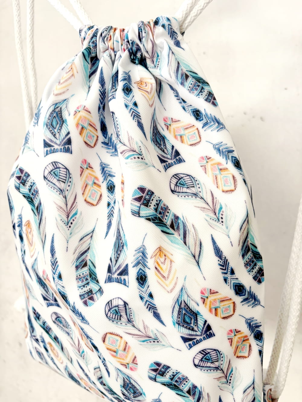 Plecak, worek z motywem piór, wykonanych metodą sublimacji.